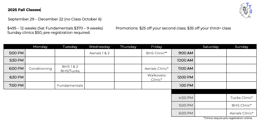 The Tumbling Gym offers unique and challenging acrobatics, tumbling and conditioning classes to students of all levels. We emphasize the importance of flexibility and strength training combined with coordination and tumbling techniques. Our coaches bring decades of experience and have built a solid and reputable curriculum that starts from the basics and progresses through walkovers, aerials, balances, variations and so much more. TTG is trusted by students and parents alike, and we are proud of the reputation we have earned.